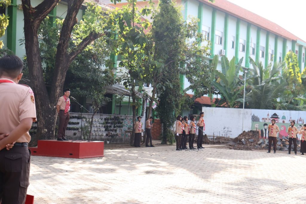 Suasana berlangsung khidmat namun penuh semangat. Barisan peserta upacara tampak rapi, berderet di bawah cahaya mentari pagi, sementara bendera Merah Putih berkibar gagah diiringi lantunan lagu Indonesia Raya. Rangkaian acara dilanjutkan dengan pembacaan Pancasila dan Dasa Darma Pramuka, yang dilafalkan dengan lantang dan penuh penghayatan oleh petugas upacara. Selain itu, suasana semakin meriah karena adanya tepuk pramuka yang dipimpin oleh Bapak Sunaji, S.Pd., M.Eng.